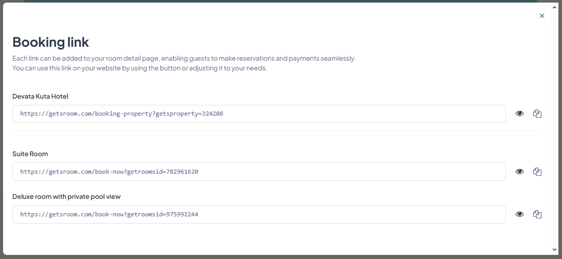 In addition to the booking widget, Getsroom also offers a Booking link that takes guests directly to your property or to each individual room you create. This simple yet effective feature makes it easy for guests to make reservations. You can place the link on your property page or customize it to lead directly to your room’s detail page.